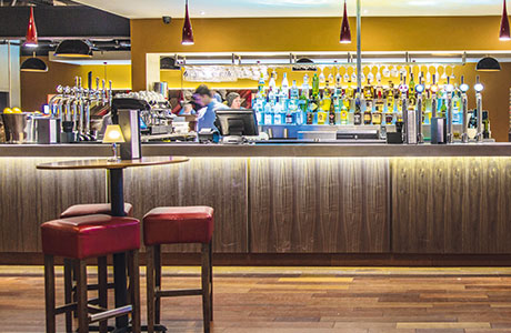 The centre of the 180-capacity venue is dominated by the U-shaped bar, which has a down-lit dark wood frontage, stainless steel top and a central stepped back-bar with fibre optics which illuminate the spirits bottles.