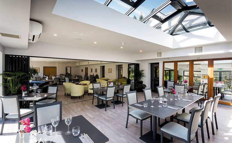 The project, which was privately funded, involved extending the property to the rear to create a flexible eating and events space with bi-fold glass doors opening onto the gardens; the space can be split into up to three smaller areas (each with its own sound, heating and air conditioning systems) or sit up to 160 all-in – up from the 40 covers the hotel could previously accommodate. The bar area, meanwhile, was reconfigured, incorporating part of the former reception area to take its capacity from 20 to 60 and create space for disabled toilets.