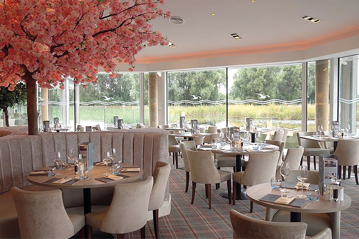Outside, the venue – a clutch of four connected ‘roundhouse’-style buildings perched on the water’s edge – has been enhanced with a large wrap-around decking at the front and, to the rear, a decked terrace which overhangs the water and is back-lit, creating the perception the building is floating.
