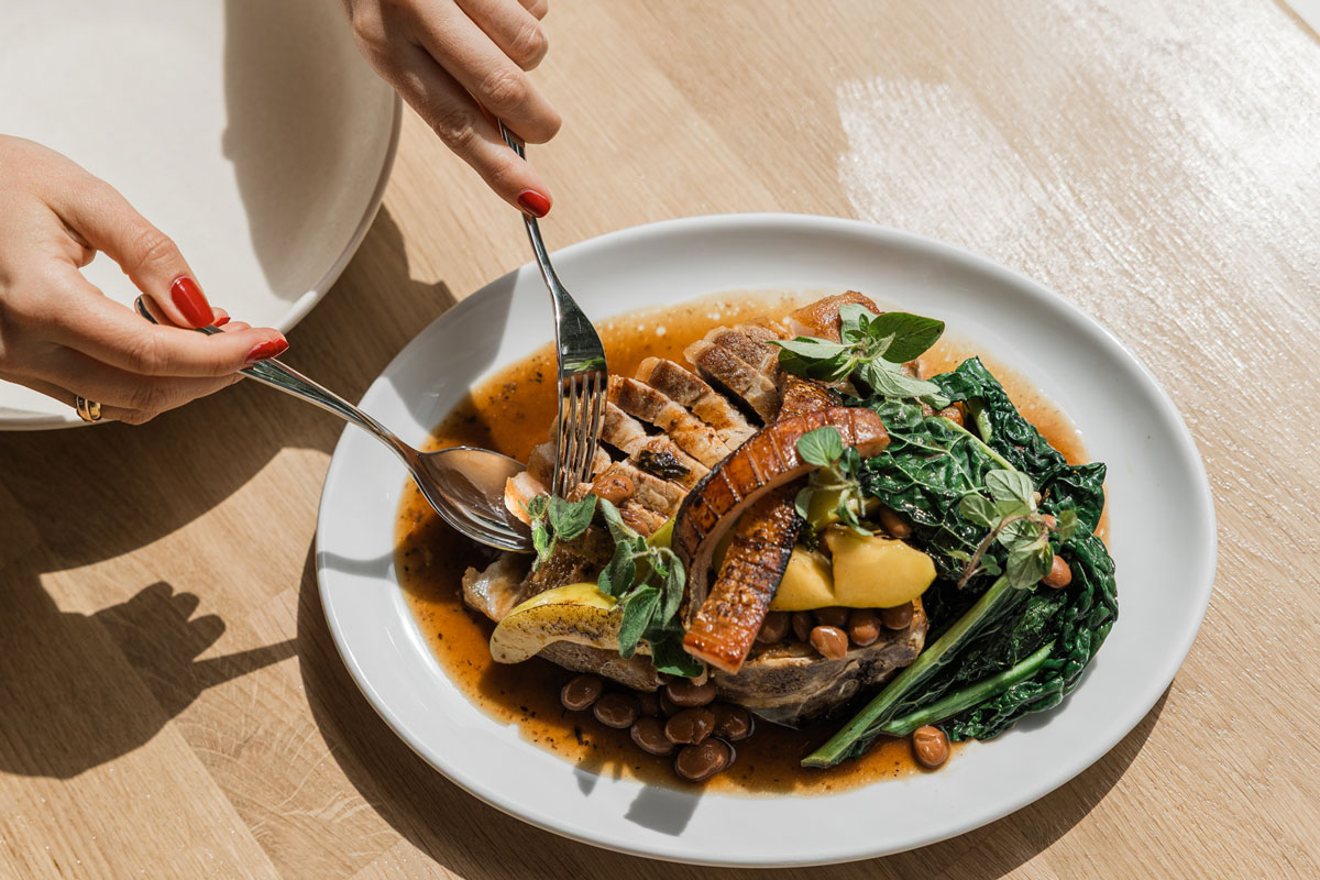 The selection of larger sharing plates includes pork chop, borlotti beans, cavolo nero and roast apple, and hake with cockles, Arenkha caviar and beurre blanc, while desserts include pavlova, mascarpone and blackberry coulis, and basque cheesecake with rhubarb compote.