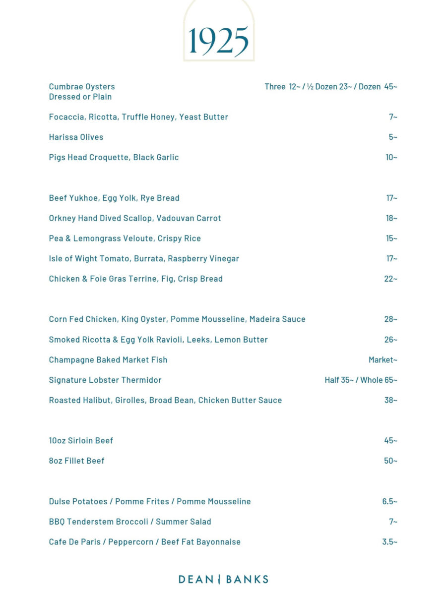 The 1925 menu offers seafood fans Dean’s signature lobster thermidor, Orkney hand dived scallops with vadouvan carrot, or champagne baked market fish.