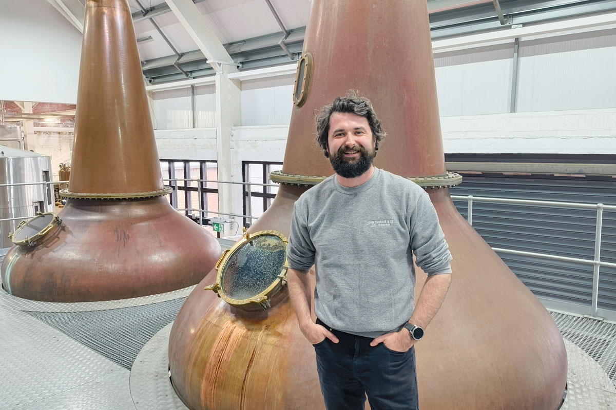 “So traditionally lowland has always been viewed as really easy to drink, really accessible. Our stills I would consider maybe a bit more Highland in style. And because they’re a little bit shorter and a little bit fatter and the spirit doesn’t have to go up as high, you get a lot more of the heavy flavours, a lot more heavy esters, heavy oils, things like that. It gives us a more chewable spirit. There’s a lot of bite to it, a lot of flavour comes across.”