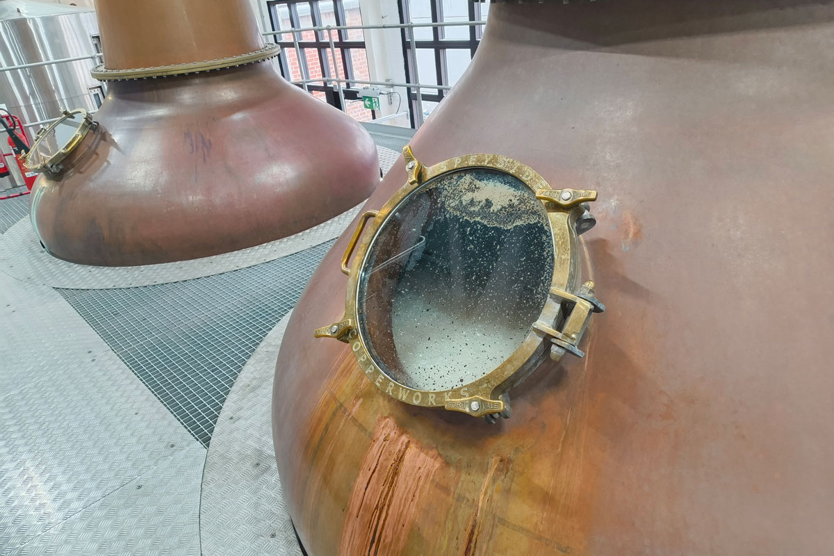 “So traditionally lowland has always been viewed as really easy to drink, really accessible. Our stills I would consider maybe a bit more Highland in style. And because they’re a little bit shorter and a little bit fatter and the spirit doesn’t have to go up as high, you get a lot more of the heavy flavours, a lot more heavy esters, heavy oils, things like that. It gives us a more chewable spirit. There’s a lot of bite to it, a lot of flavour comes across.”