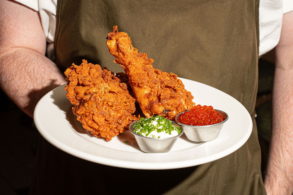 Birds signature Buttermilk Fried Chicken Thigh, brined and expertly fried, is then served with Katy Rodger’s Crème Fraîche and Smoked Salmon Roe.