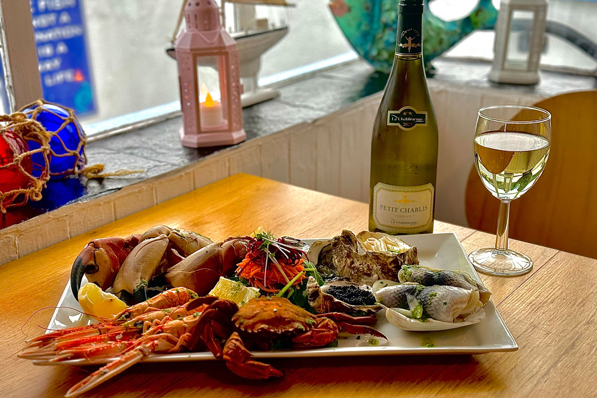Cold shellfish platter with fresh-caught langoustine, crab claw, caviar, velvet crab, roll mop herring and dressed salad.