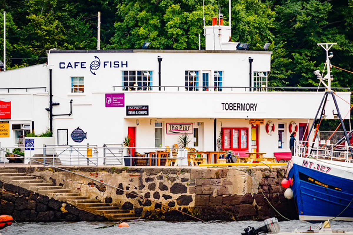 Café Fish, overlooking the harbour in Tobermory, was opened in 2006 in the former Tobermory ferry terminal. It offers a menu of the freshest seafood, paired with a dozen high-quality wines from around the world.