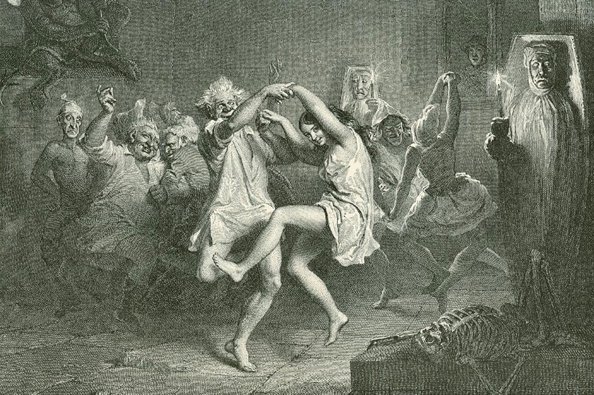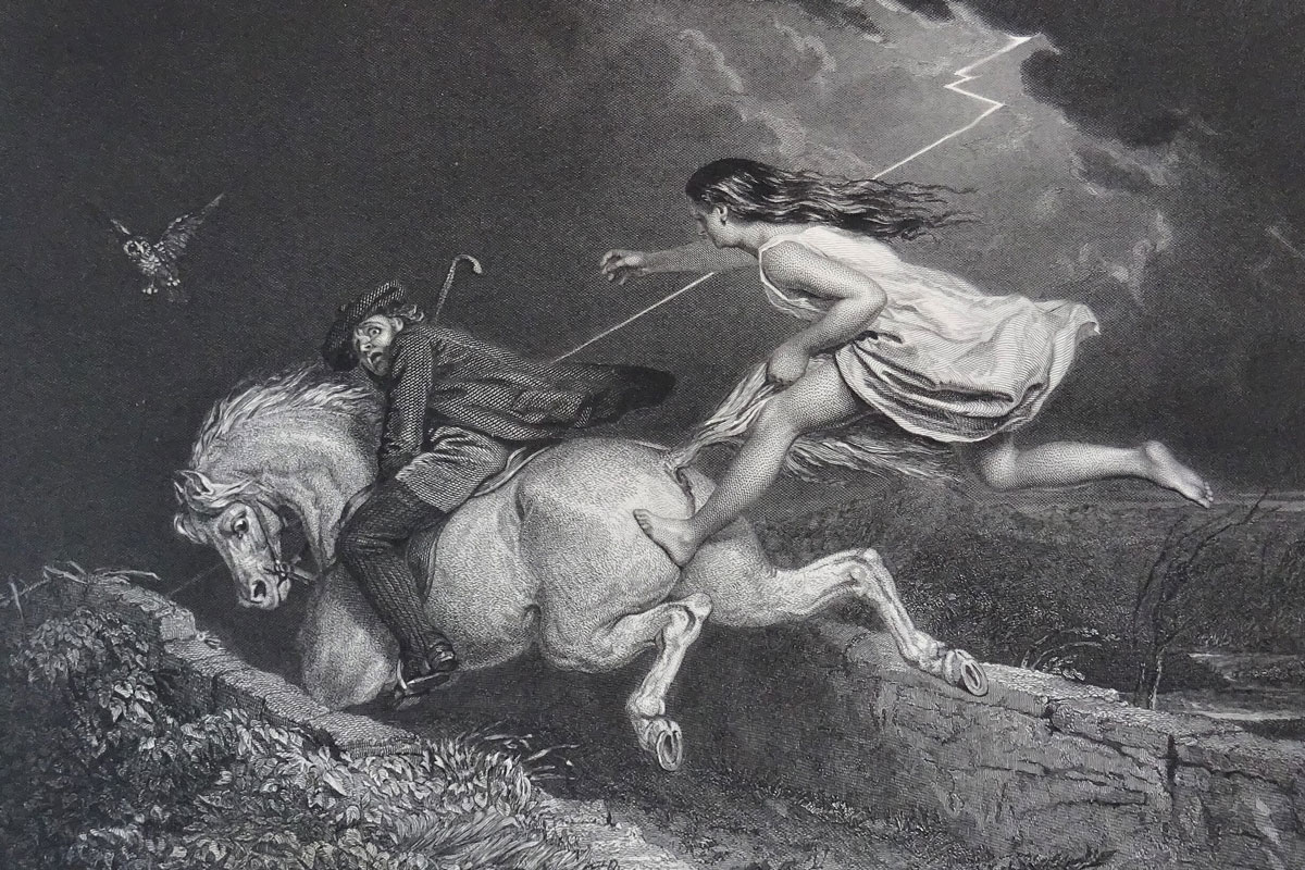 In Burns’ poem, when Tam finally makes his way home over those long dark country miles, he passes the ruined Alloway Kirk, and becomes witness to a hedonistic gathering of witches and demonic creatures.