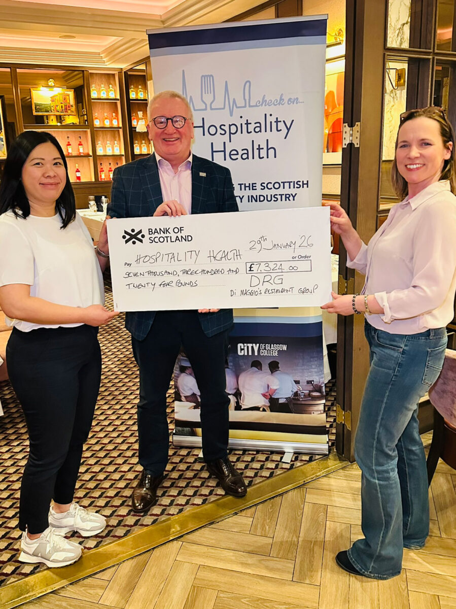 Hospitality Health, the Scottish charity dedicated to improving the health and wellbeing of people working in the hospitality and tourism industry, has been presented with a cheque for £7324 by The Di Maggio’s Restaurant Group.