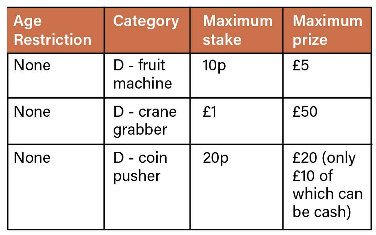 Category D machines cover a multitude of lower stakes and prizes machines including but not limited to the undernoted. These are rarely found in pubs in my experience.