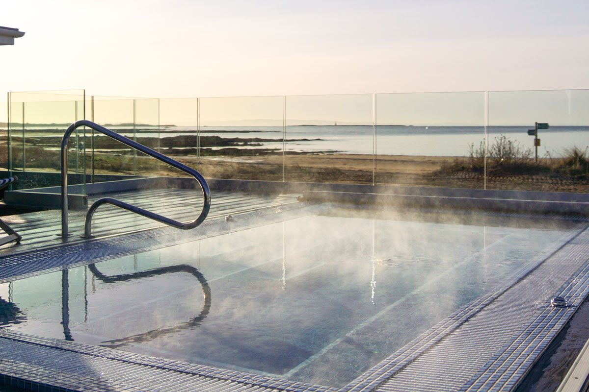 Overlooking the beach, the new facility has a strong focus on the outdoors with a large hydro pool, sauna with views across to Ailsa Craig, outdoor showers including a cold drench bucket, a sheltered fire pit and seating area, as well as direct beach access from the spa garden.
